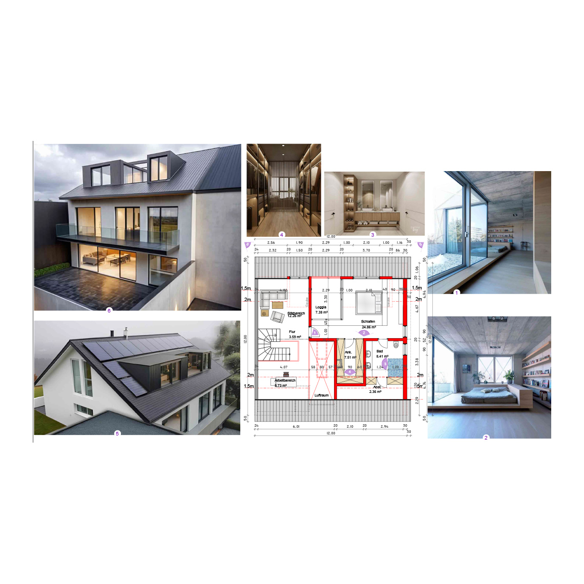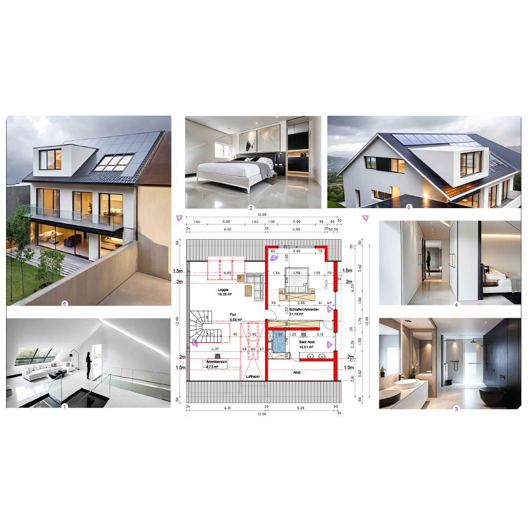 Unser Projektmitarbeiter Muhammet Yavuz entwickelte mehrere Vorentwurfsvarianten für die Ausgestaltung des Dachkörpers, die in zwei Entwurfsvarianten mündeten. Das Augenmerk liegt im Entwurf auf der Visualisierung des Innenraumes und die innenarchitektonische Gestaltung und Möblierung. In sogenannten Moodboards werden dem Bauherrn Gestaltungsstile aufgezeigt, um dem Geschmack des Bauherrn gerecht zu werden.