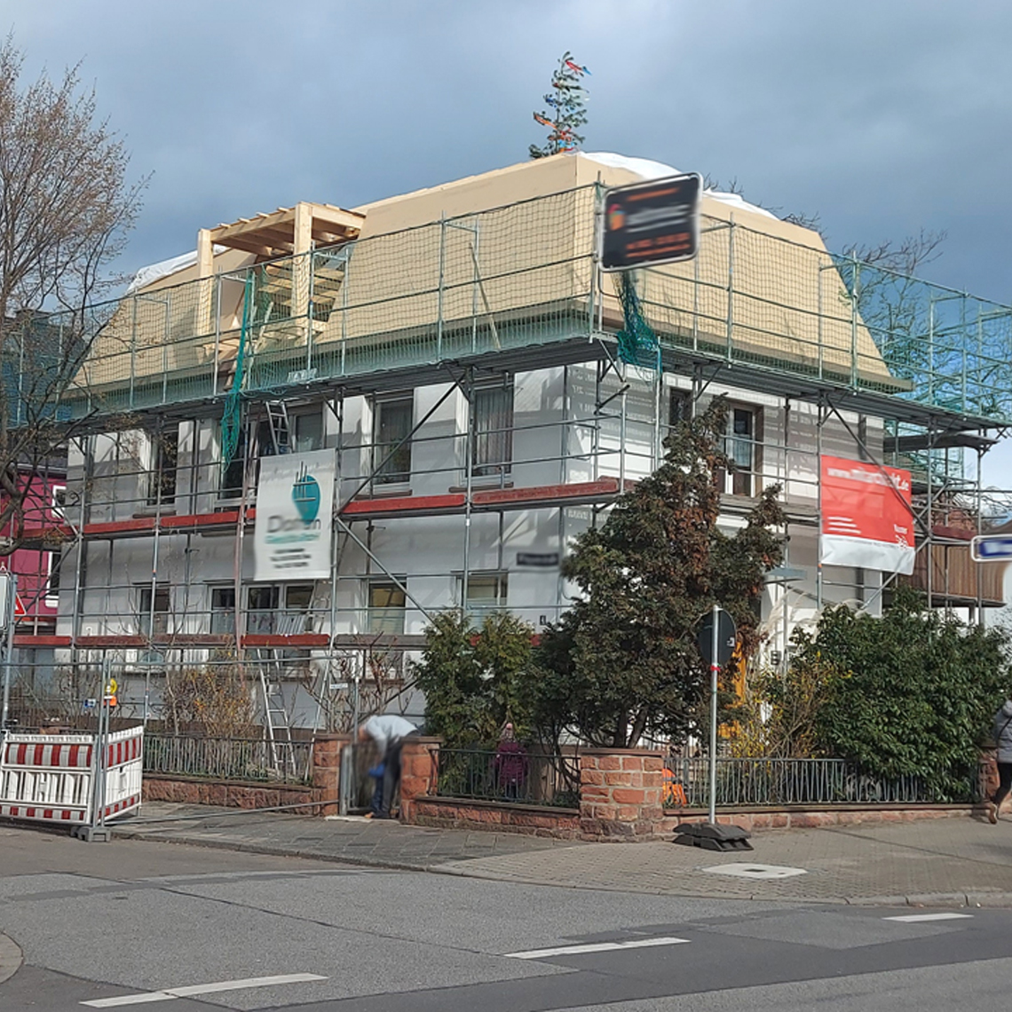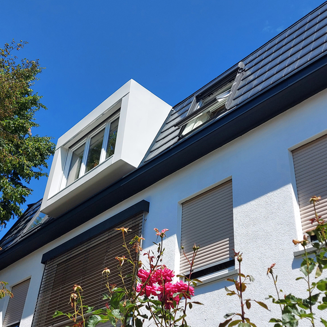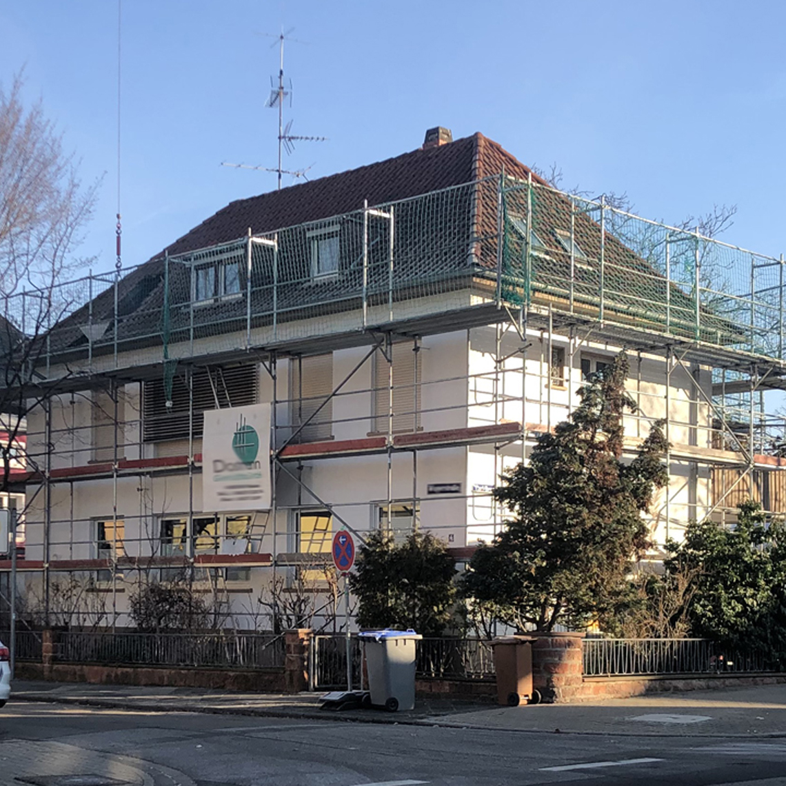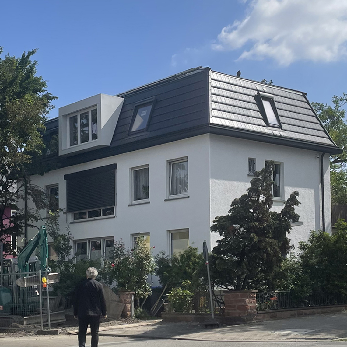 Anfang der 80er Jahre wurde das 50er-Jahre Wohnhaus zum Garten erweitert. Die jetzigen Besitzer wollten das alte Dachgeschoss, in der sich eine Mietwohnung befindet, von uns ausbauen lassen. Im Frühjahr 2021 begann der Abriss des alten Holzdachstuhls. Eine neue Dachform, ein Walmdach, sowie großzügige Gauben schaffen mehr Raum.