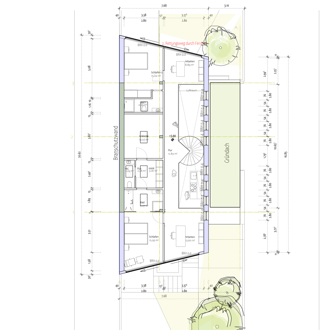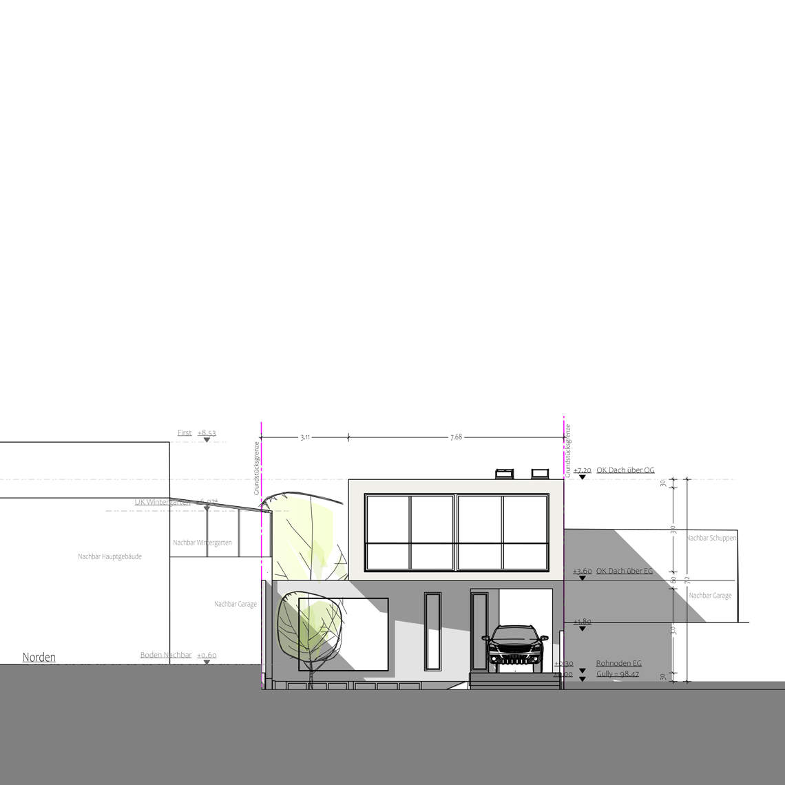 Individuelle Architektur in zweiter Reihe – geplant für höchste Ansprüche Auf einem anspruchsvollen Grundstück in zweiter Reihe entstand ein individuelles Architektenhaus mit moderner Gestaltung und hochwertiger Ausführung. Der Entwurf stammt von unserer Architektin Parez Qader, die Umsetzung verantwortet Beatrice Schenk gemeinsam mit Herrn Naumer in der Bauleitung.