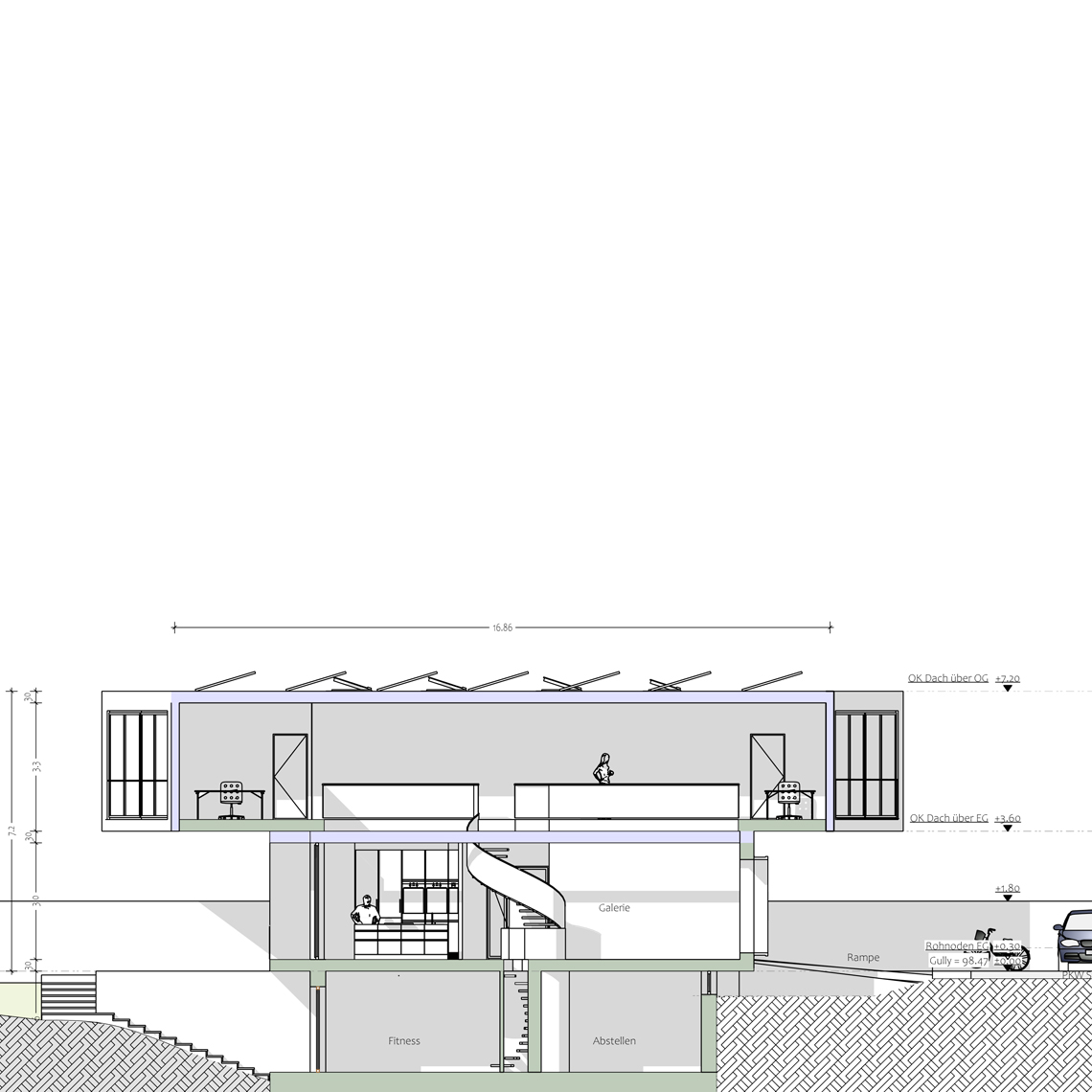 Auf zwei Ebenen bietet das Wohnhaus großzügige Räume mit fließenden Übergängen. Neben dem Wohn- und Essbereich umfasst das Haus ein Fotostudio, einen Gästebereich sowie einen eigenen Fitnessraum – perfekt abgestimmt auf die Bedürfnisse der Bauherren.