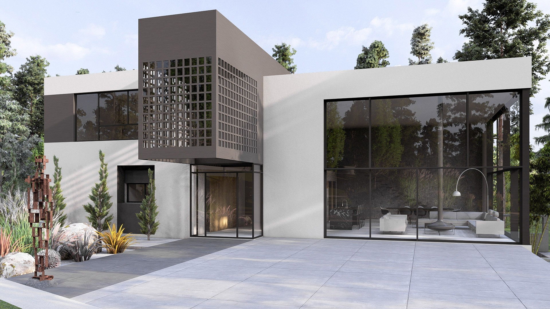 Der Eingangsbereich wird in Szene gesetzt durch einen sich herausschiebenden dunklen Gitterkubus, welcher Vordach und Aussichtszimmer in Einem ist. Großzügige Glasflächen spiegeln den grünen Naturraum wider und verleihen der großzügigen Architektur eine angemessene Maßstäblichkeit.