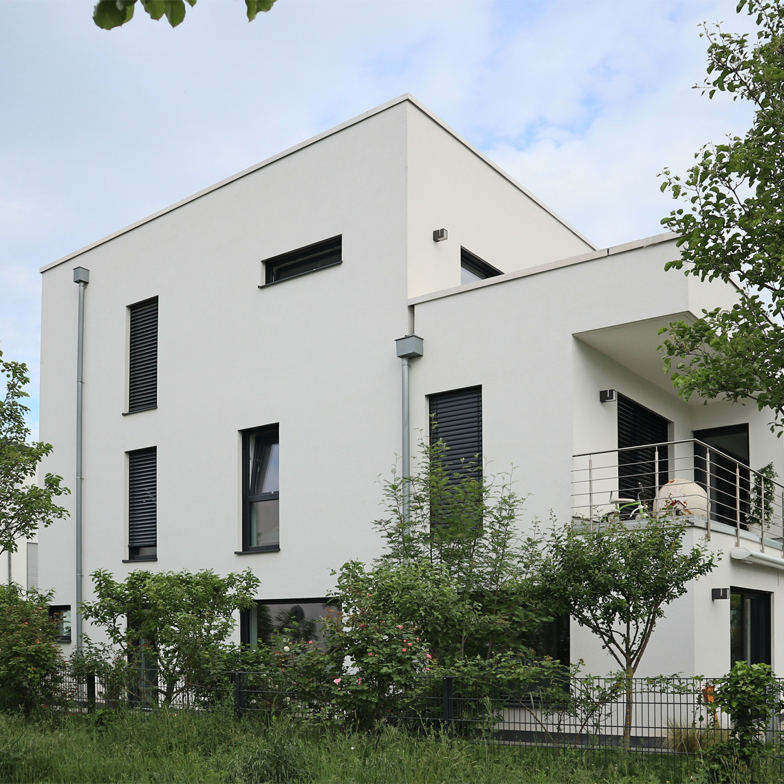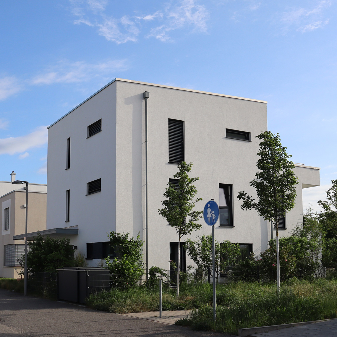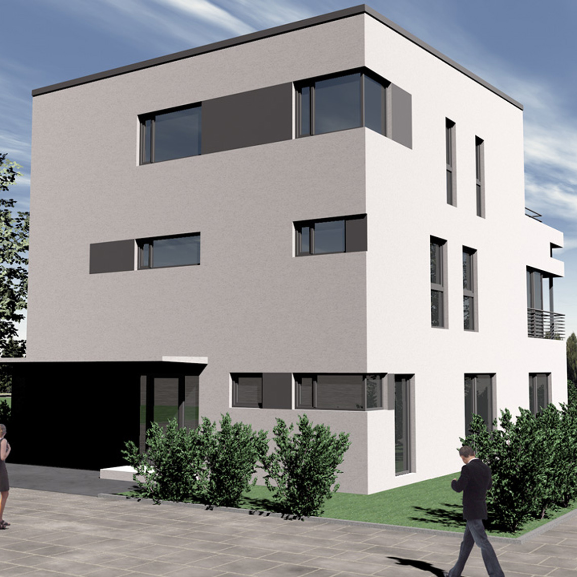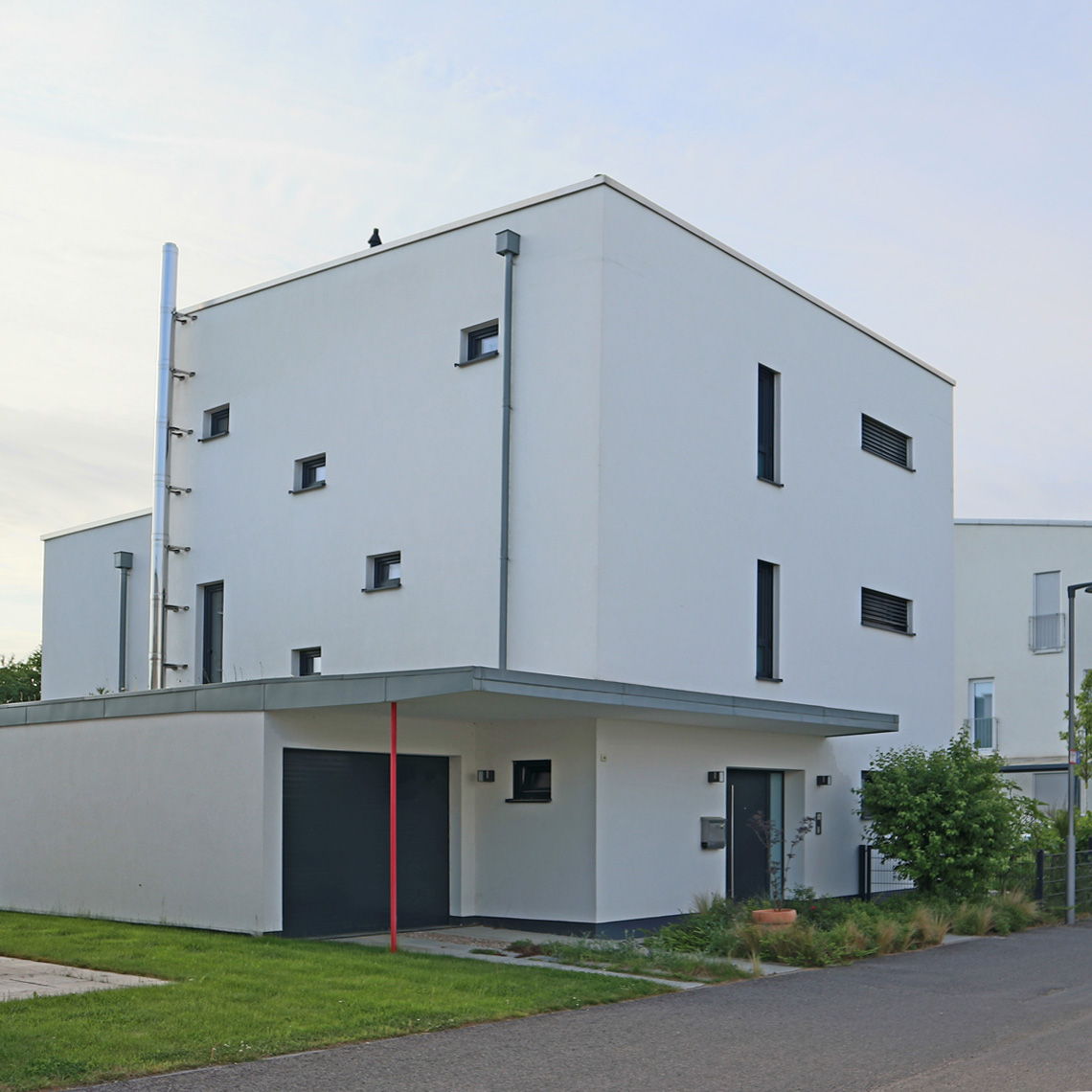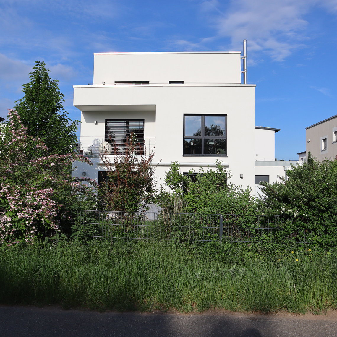 Das moderne Einfamilienhaus ist nach Passivhausstandard mit Solaranlage auf dem Flachdach und Regenwasserzisterne gebaut. Es ist altersgerecht und barrierefrei mit einem Aufzug über alle Geschosse ausgestattet. Bauherrenwunsch war es ein neues Haus im Bauhausstil zu entwickeln.