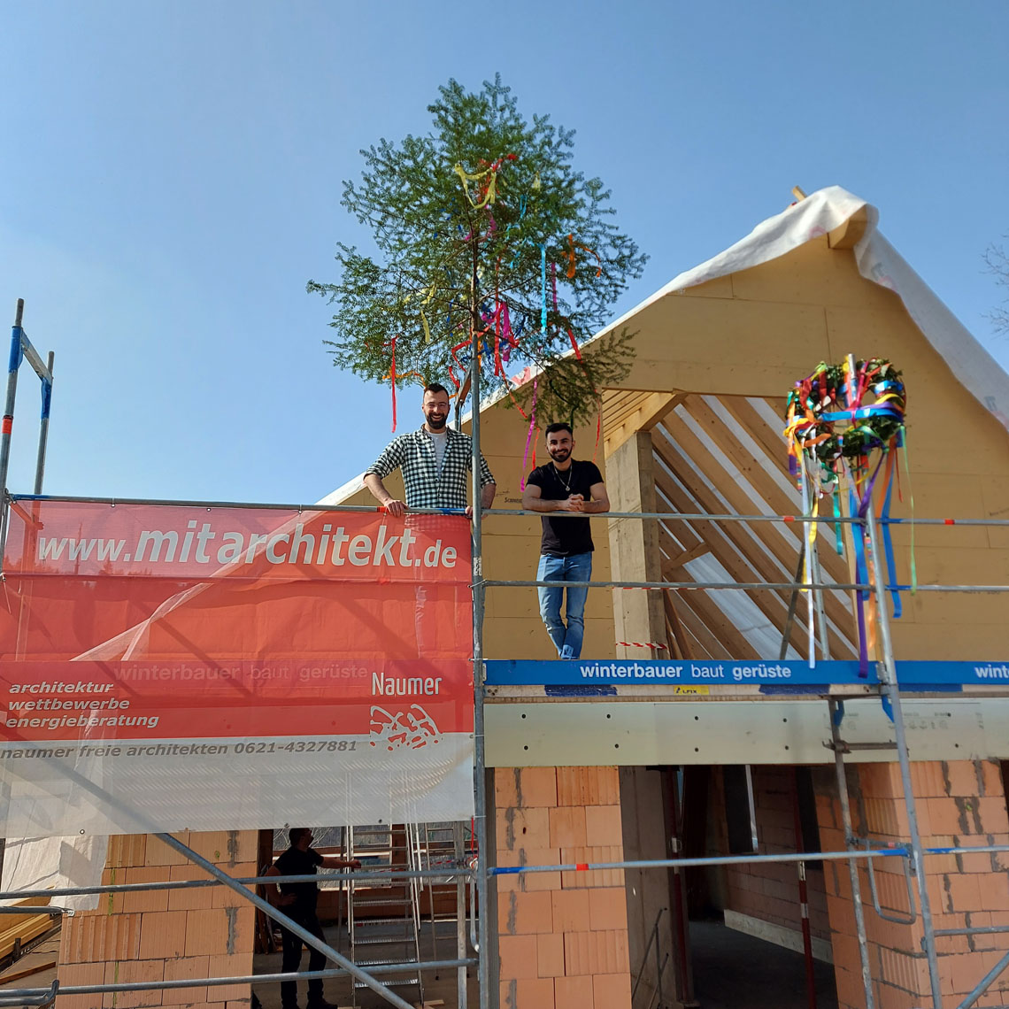 Die Bauherren feierten gemeinsam mit vielen Handwerkern und dem Team Naumer Architekten. Die Zimmerleute ließen es sich nicht nehmen traditionell die Richtkrone zu befestigen und einen Richtspruch an die Bauherren und alle Baubeteiligten zu richten. Ein entscheidender Bauabschnitt - die Rohbaufertigstellung - ist erfolgreich gemeistert.