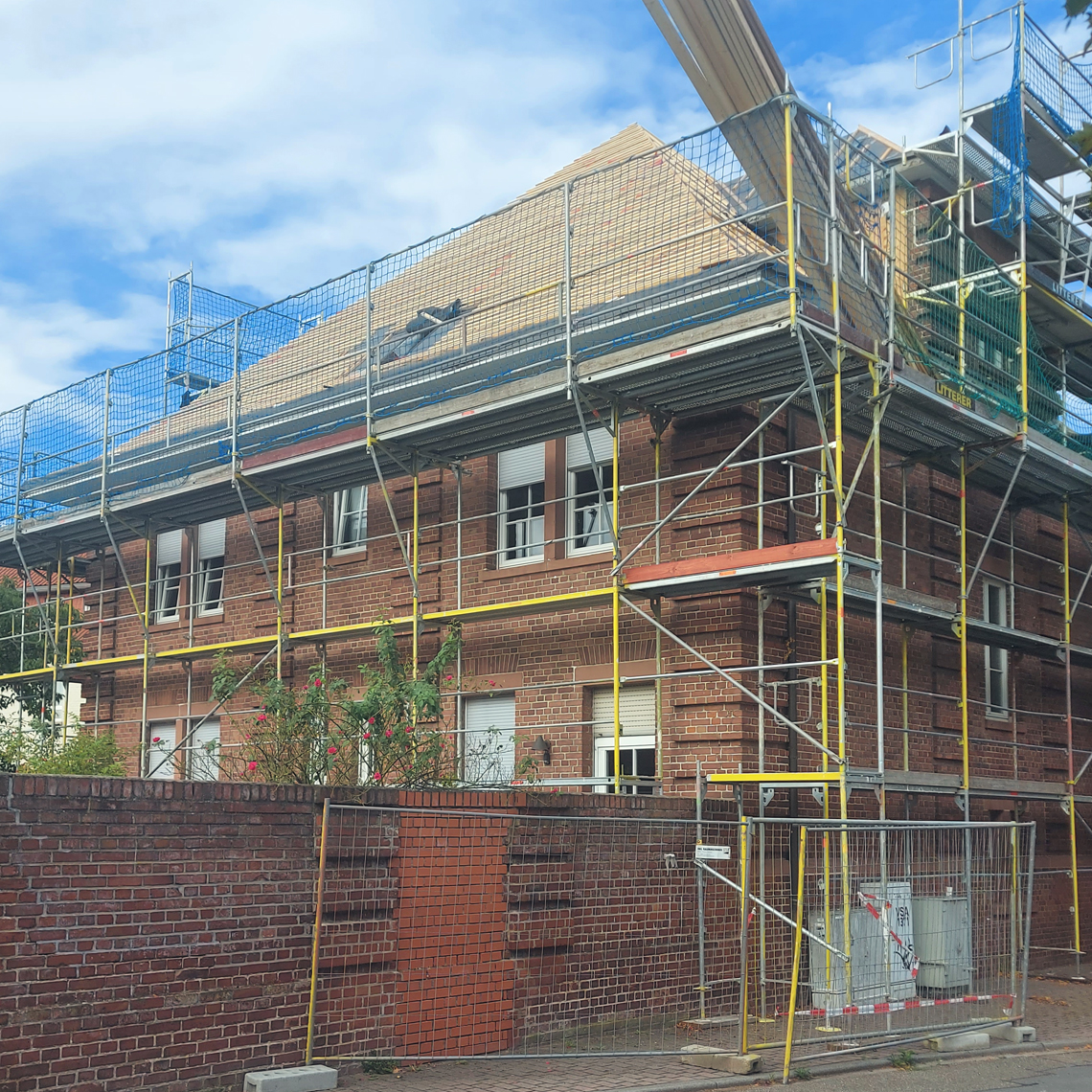 Die dringend notwendige und wichtige Dachsanierung ist nun rechtzeitig vor den Wintermonaten in der Fertigstellung. Das eingerüstete Denkmal wird nun fachgerecht saniert und das schöne historische Gebäude in Kürze mit neuem Dach erstrahlen. Seit vielen Jahren arbeiten Naumer Architekten sehr vertrauensvoll und erfolgreich mit der Firma softronic Haustechnik und Holzbau GmbH aus Mannheim zusammen, die den reibungslosen Bauablauf gemeinsam mit Herrn Dr. Naumer bewerkstelligen.