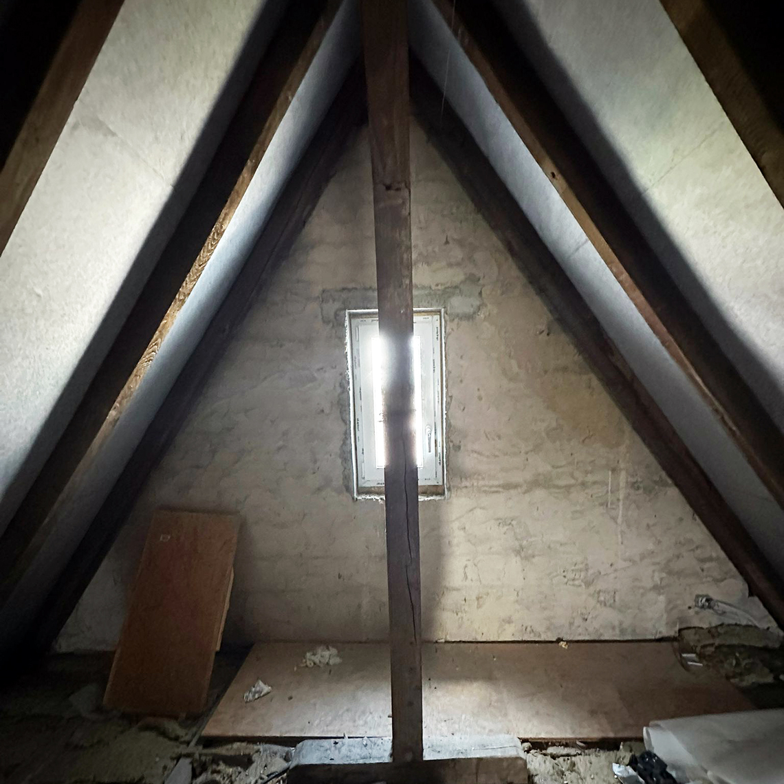 Der bislang ungenutzte Spitzboden wird zu einem behaglichen Lese- und Arbeitszimmer umgestaltet und in die neue Wohnstruktur integriert.
