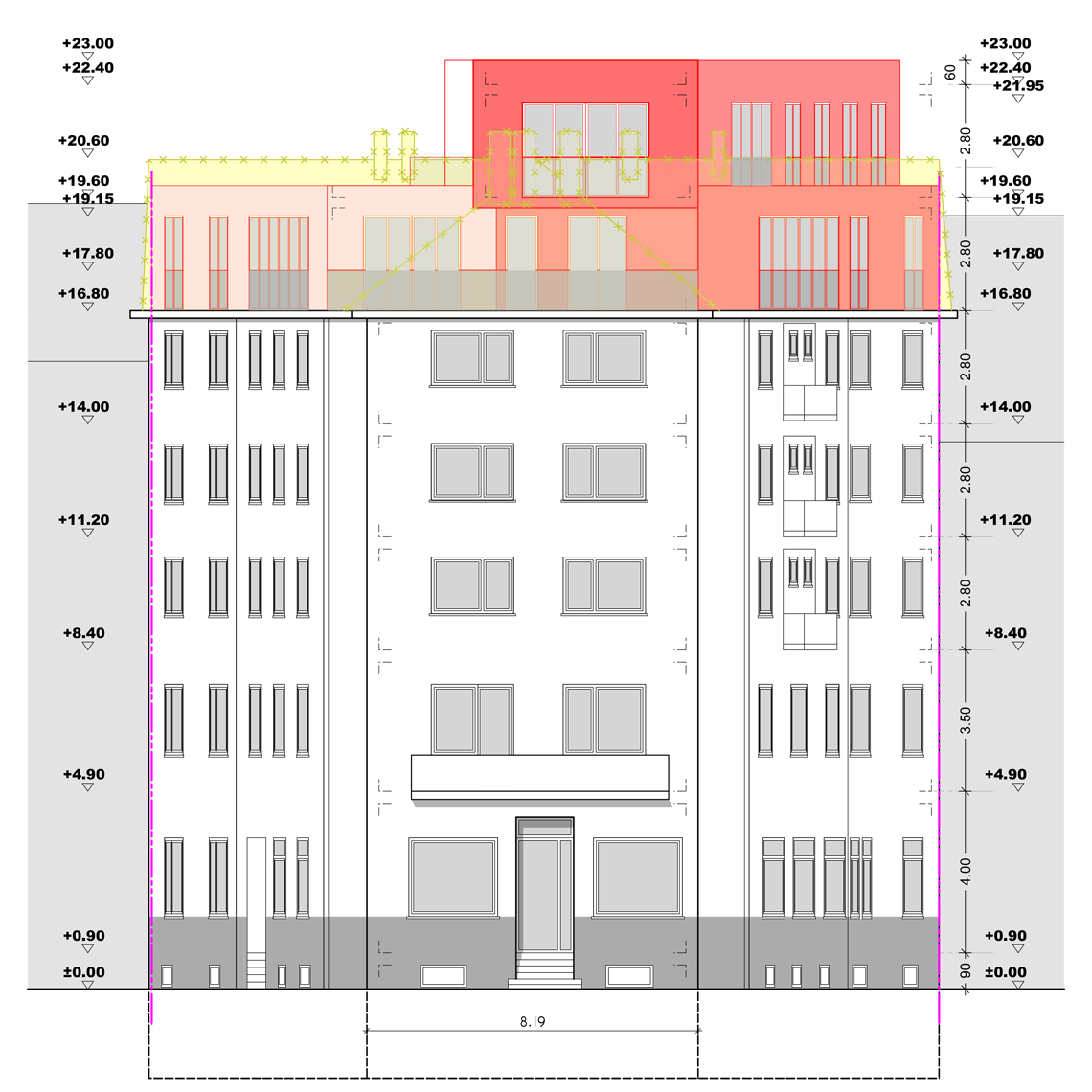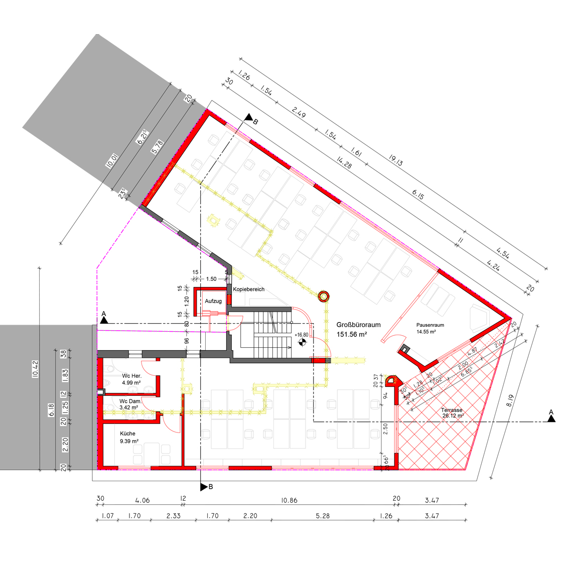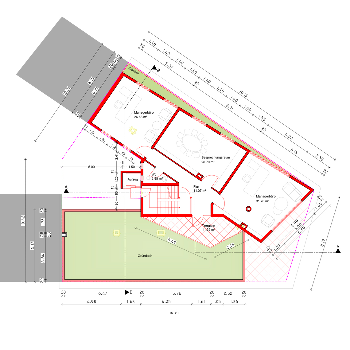 Der Bauherr plant ein neues Dachgeschoss mit Büros in zwei Ebenen mit zwei Managerbüros und großem Besprechungsraum im zweiten Dachgeschoss mit großzügigem Gründach. Das Dachgeschoss soll über einen Außenaufzug erschlossen werden. Es entsteht eine moderne Bürolandschaft über den Dächern der Schwetzingerstadt. Naumer Architekten haben die Entwurfsplanung und Genehmigungsplanung erstellt und erfolgreich eingereicht.